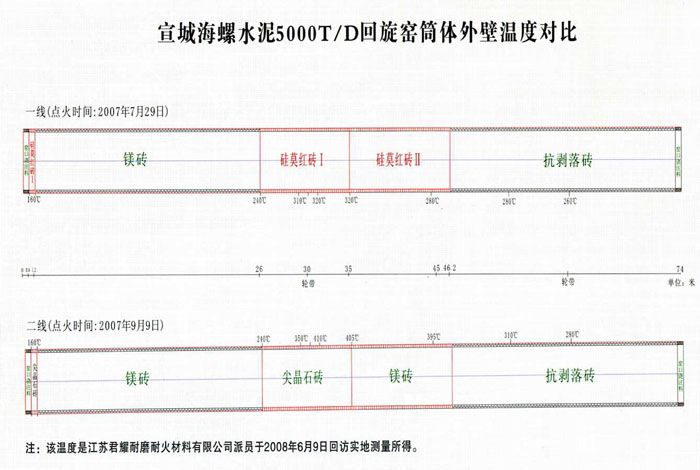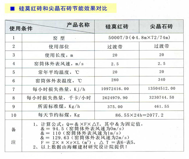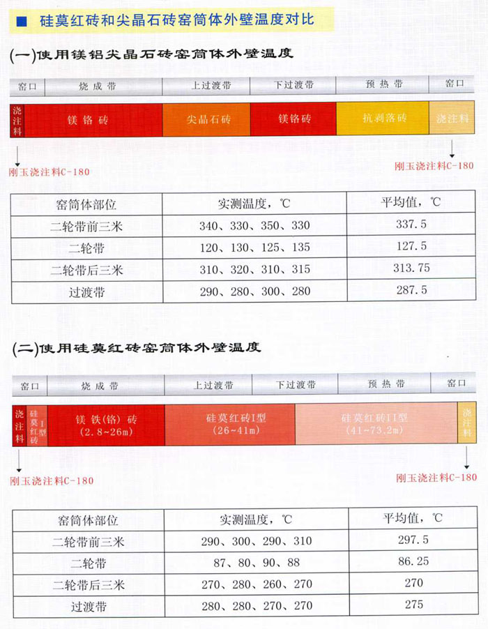过渡带特别是轮带附近的过渡带内,温度变化频繁,窑皮不易挂牢,时挂时掉。如果使用镁铝尖晶石砖,由于该砖挂不住也挂不好窑皮,使得该砖导热系数大,热震稳定性差的缺点暴露无遗;由于该砖导热系数大(≥2.6W/M·k),使得窑筒体外壁温度较高,极易受热膨胀,致使窑中部托轮承受压力较大,托轮瓦温度升高,影响设备的正常运行;该砖热震稳定性差,在轮带附近的使用寿命甚至比烧成带的使用寿命还短。由于硅莫红砖的导热系数(≤1.7W/M·k)要远低于镁铝尖晶石砖,所以采用硅莫红砖的窑筒体外壁温度要比采用镁铝尖晶石砖平均降低40℃,既节约了能源又减轻了设备自重,更达到了保护设备的目的。而且由于硅莫红砖在高温时强度高、耐磨性能好、热震稳定性高,特别适用于包含了轮带的过渡带。